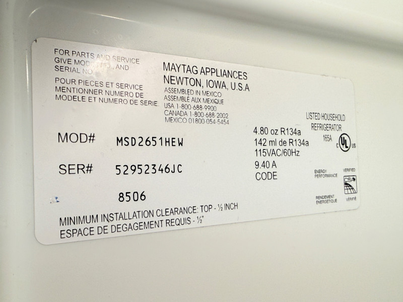 Maytag Side-by-Side Refrigerator / Freezer Bidding on this lot is an agreement that: (1) You will have 2 or 3 capable, able bodied persons to lift and load at a minimum. (2) You will bring a hand truck and/or any other tools needed to remove this item. If these steps are not followed your next item will be forfeit and no refund given.