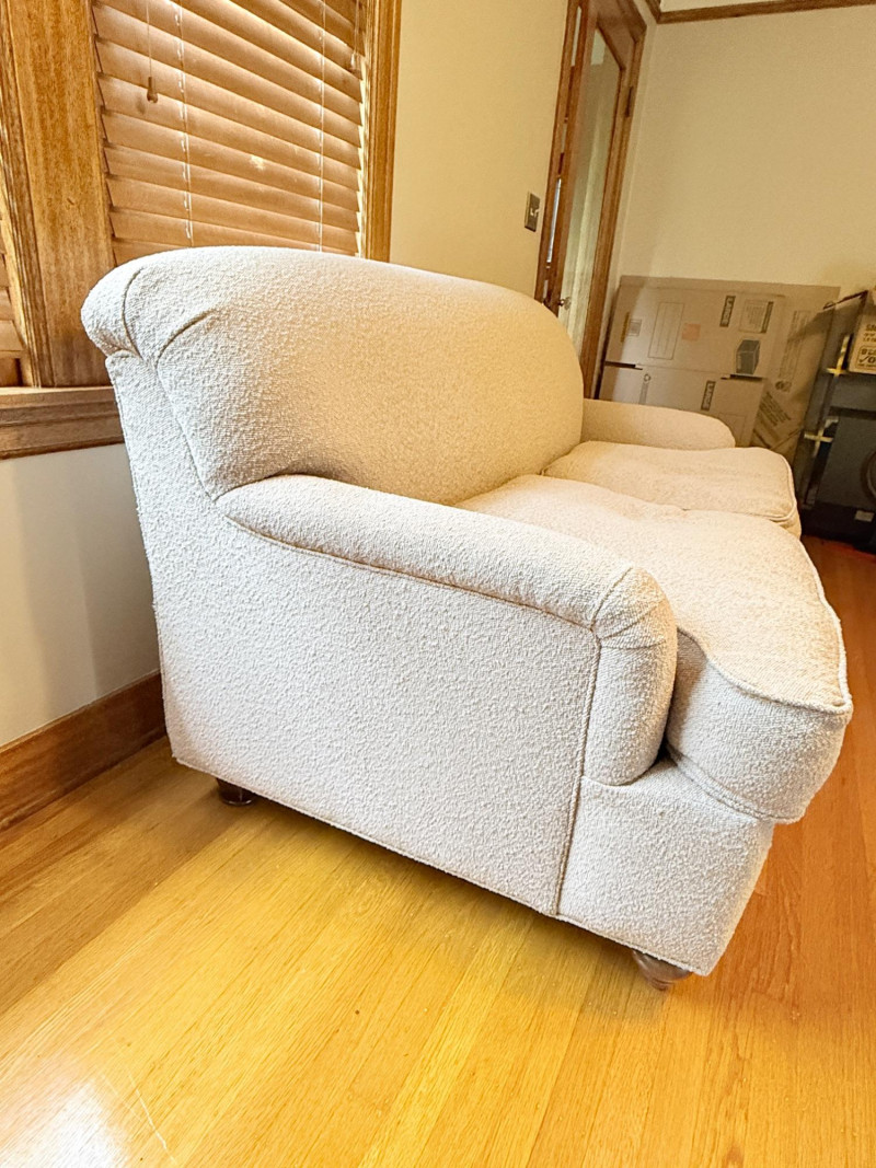 Solid Wood Loveseat - Recent Fabric Reupholstery - w/Turned Wood Feet Bidding on this lot is an agreement that: (1) You will have 2 or 3 capable, able bodied persons to lift and load at a minimum. (2) You will bring a hand truck and/or any other tools needed to remove this item. If these steps are not followed your next item will be forfeit and no refund given.