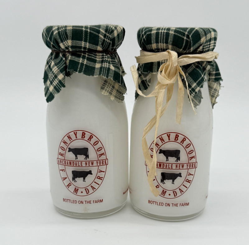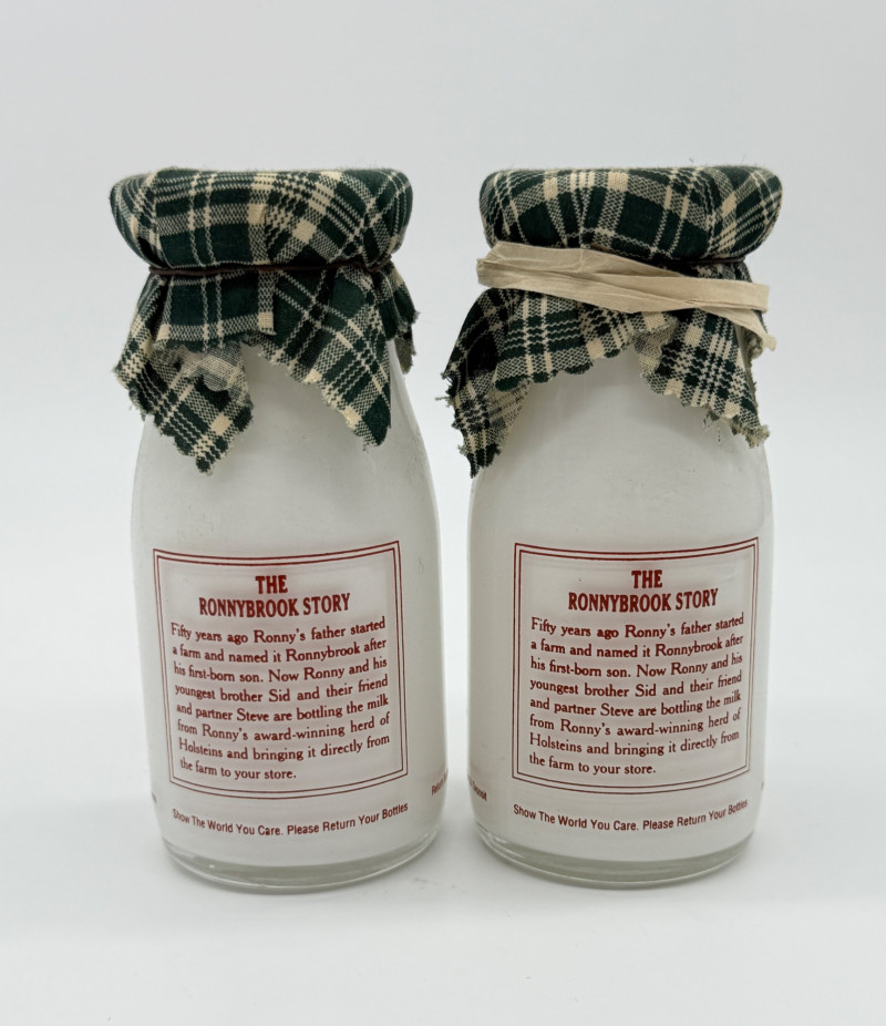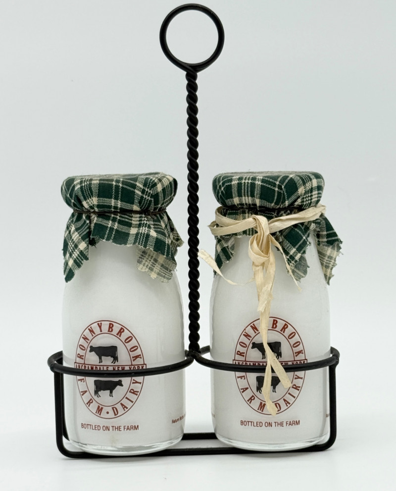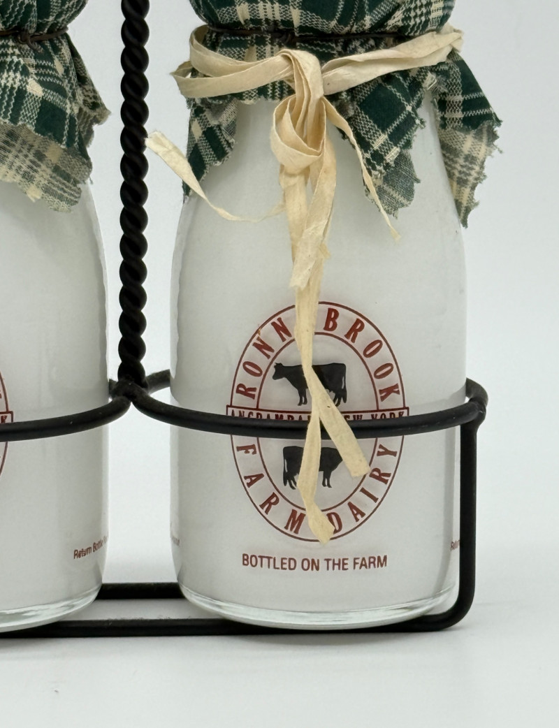 Vintage Ronny Brooks Farm Dairy Bottles w/ Metal Carrier