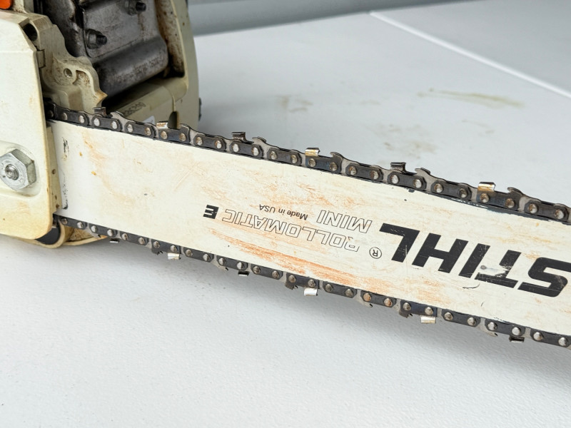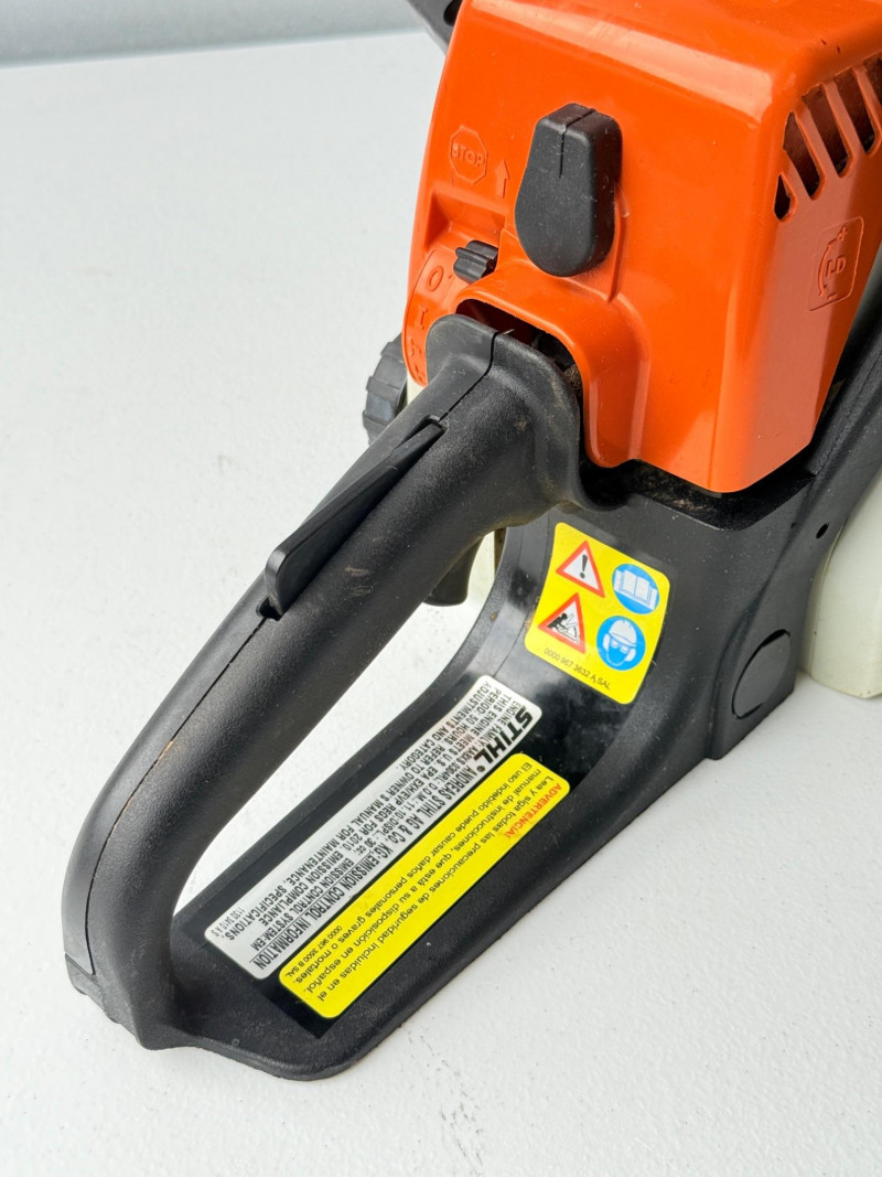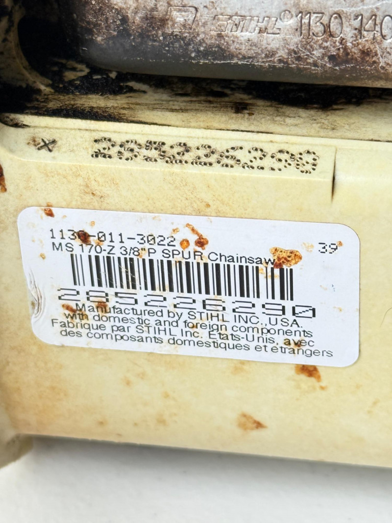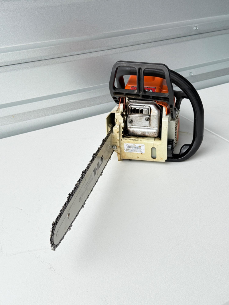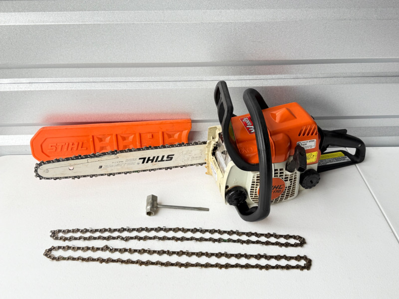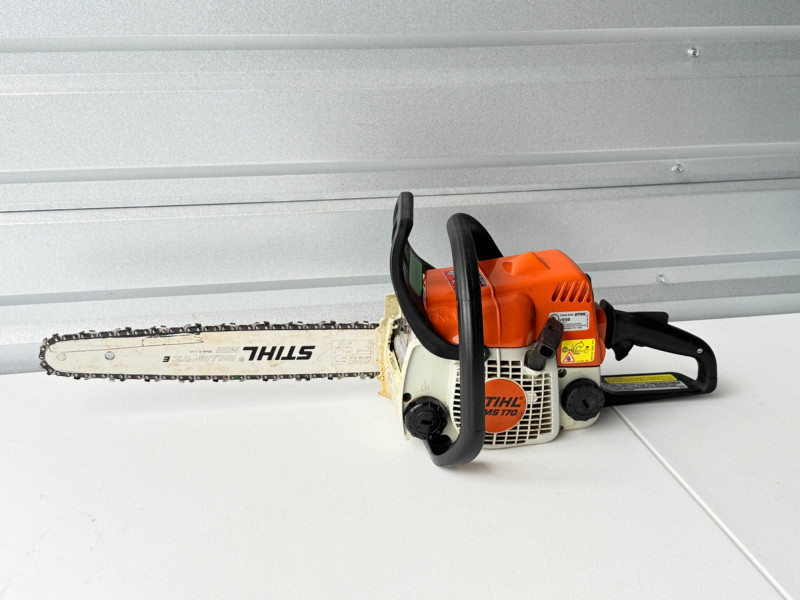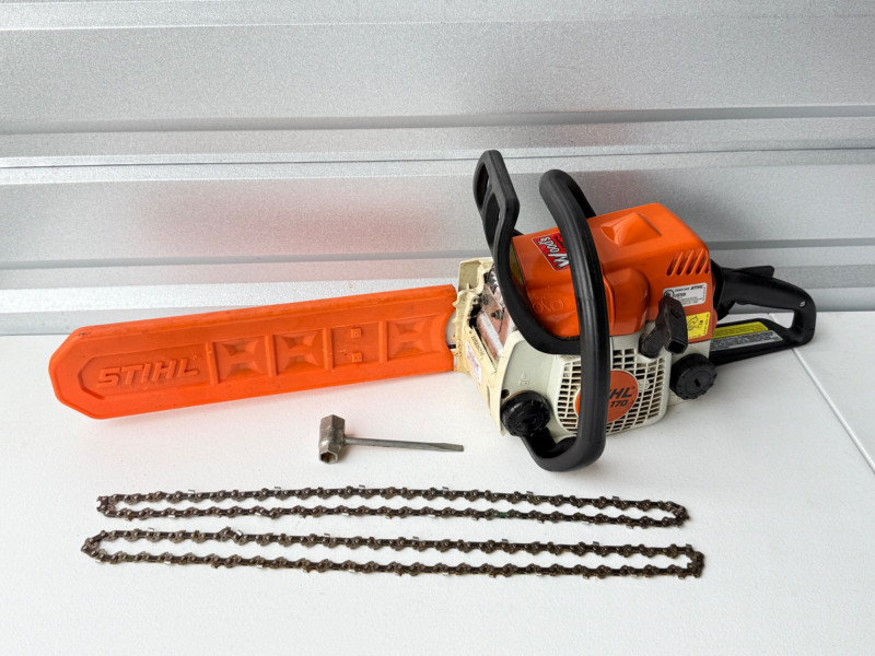 MS 170 Stihl Chainsaw (Arlington Pick Up Only) Stihl chainsaw in great shape. Smaller lighter gas powered chainsaw. Comes with saw tool and 2 extra chains. Saw started up very easily and ran smooth.